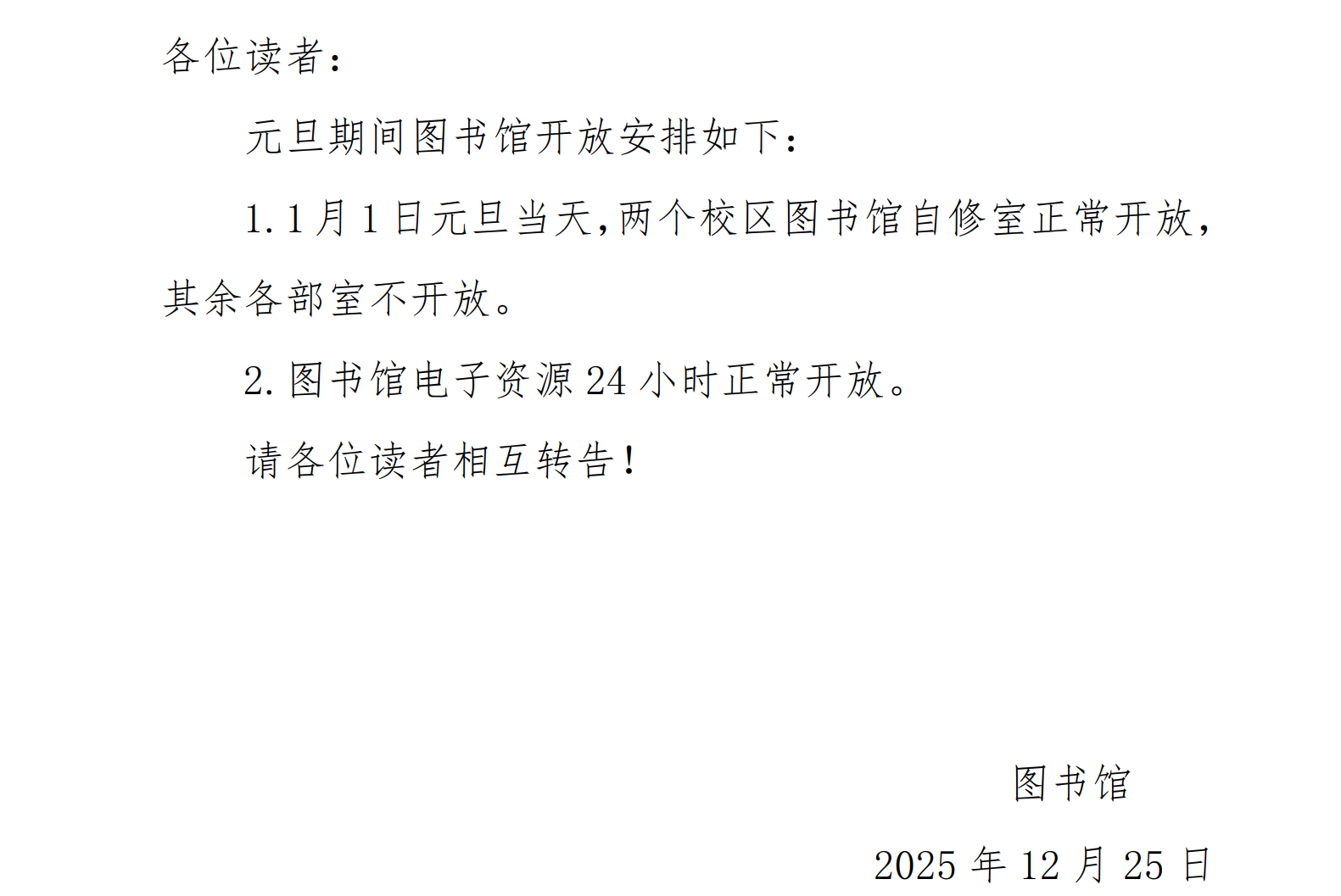 关于2026年元旦图书馆开放安排的通知