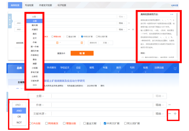 1.字段检索(包括高级检索):选择一个检索项,可以输入一个检索词,也可以灵活运用检索界面中的“+”、“-”或逻辑运算符“AND”、“OR”、“NOT”进行多字段联合检索。
