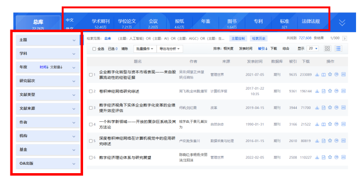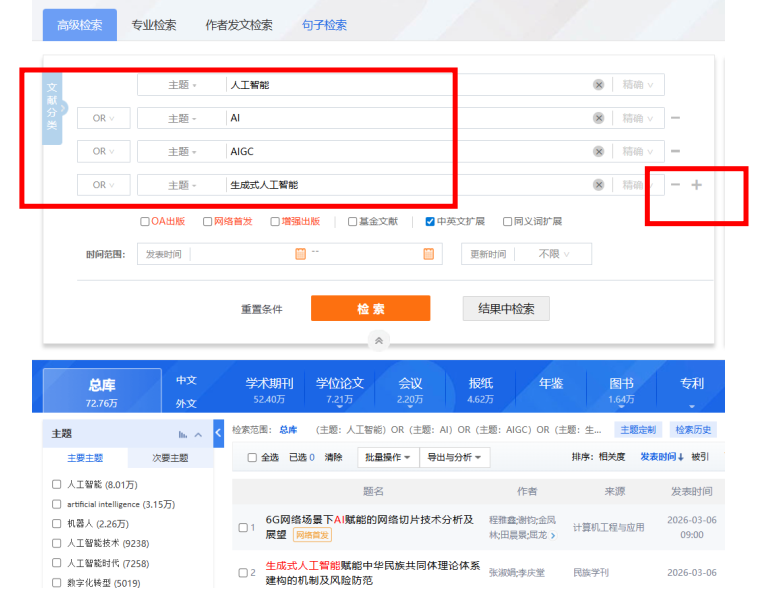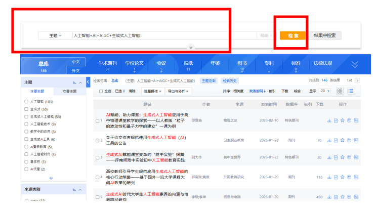 选择“主题”检索途径,以“人工智能+ AI+ AIGC+生成式人工智能”为检索式,点击“检索”就得到了我们需要的检索结果: