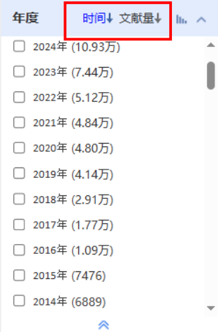 按时间排序:如果你想追踪研究前沿,看最新发表文献,选择年度倒序排列;如果你是做文献综述,需长时间跨度,按需选择年度。