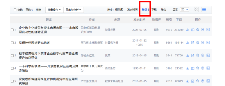 按被引排序:高被引文献通常是该领域的核心文献或重点文献,可以按“被引”排序进行筛选。
