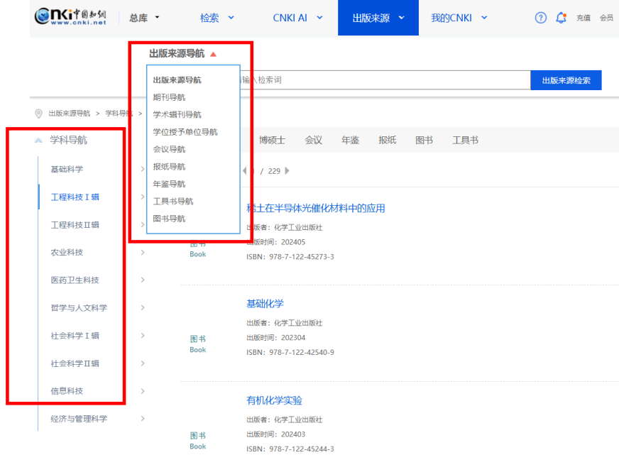 选择“出版物检索”——“学科导航”或“出版来源导航”可快速锁定知网收录的相关领域的全部期刊信息。