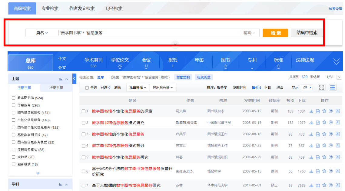 (2)如果需检索篇名包含“数字图书馆”和“信息服务”的文献,在篇名检索项后输入:'数字图书馆' * '信息服务'。可以检索到篇名同时包含上述信息的文献。