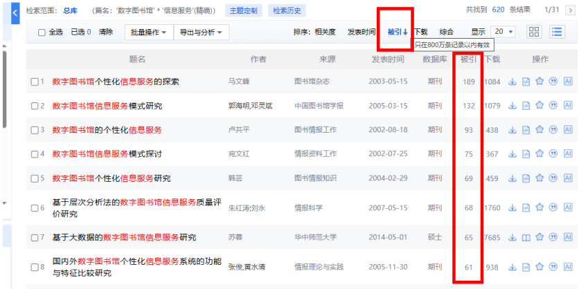 一般认为,引用率较高的文献具有较高价值,在检索结果页面,点击检索结果页面-通过被引排序,可一键锁定高被引文章。