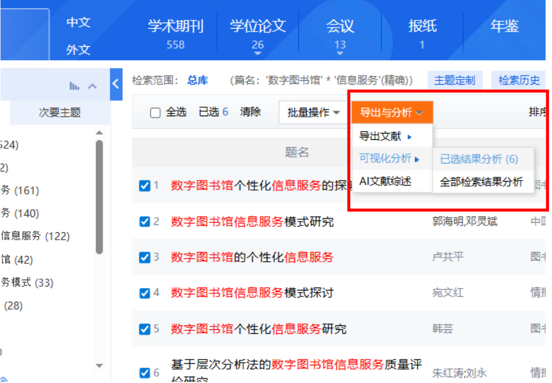 选择需要分析的文献,可以对选中的文献或全部检索结果进行可视化分析。