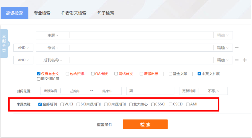 也可以在高级检索中,通过来源类别,对期刊的来源层次进行勾选。