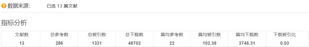 指标分析:通过文献数、总参考数、总被引数、总下载数、篇均参考数、篇均被引数、篇均下载数、下载被引比等对所选文献进行指标分析,通过指标可掌握所选文献的总体质量。