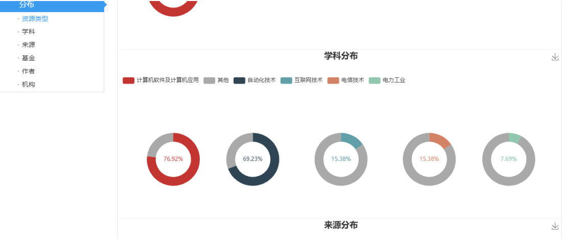 分布分析:从资源类型、学科、来源、基金、作者、机构等多个维度揭示检索词的分布关系。可通过机构分布找到相关领域内的权威机构。