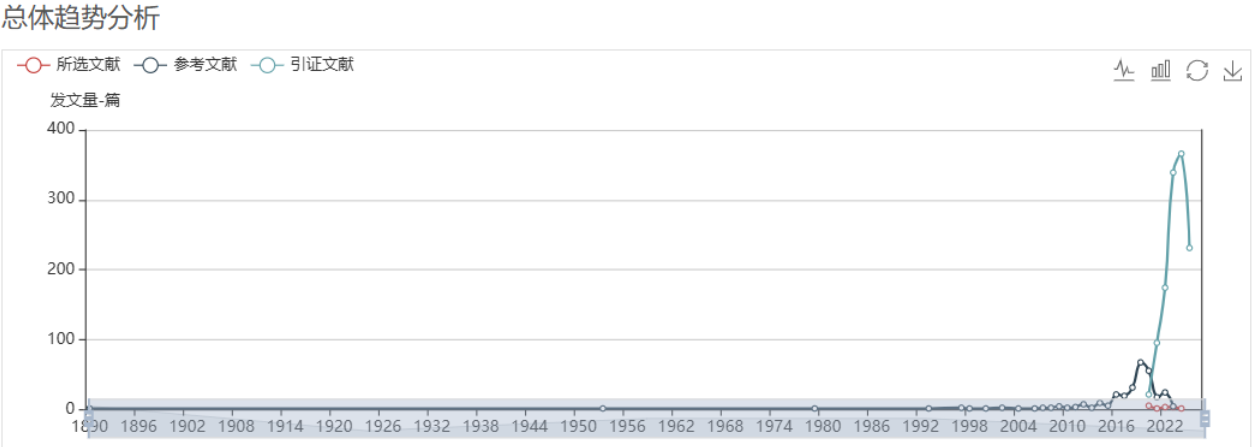 总体趋势分析:以线段的形式对所选文献、参考文献、引证文献在其发表时间年度范围内的数量趋势进行分析。