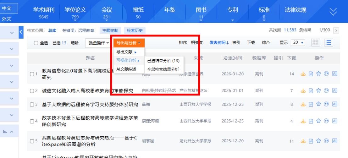 不会做数据图?知网可视化助你一臂之力。在检索关键词后,我们点击导航栏的“导出与分析”,选择“可视化分析”,知网会将文献检索结果的总体趋势、分布、主要主题、次要主题、研究层次、文献来源、作者、机构、基金等信息用图表来进行展示。