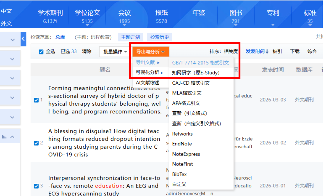 写论文时一篇篇插入引用文献?不仅费时费力,格式还容易不统一。利用知网,快速搞定。检索文献后,选中所需文献,点击“导出与分析”,选择“导出文献”,一般论文写作选择第一个格式就行啦。