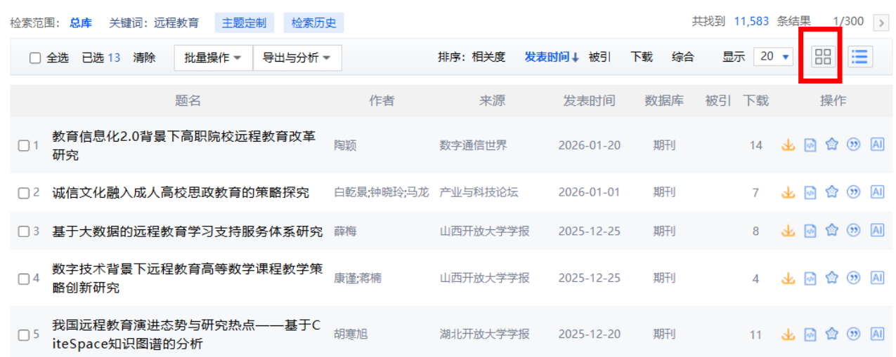 筛选文献时,一篇篇点开文献阅读摘要对检索结果进行筛选?效率太低了。教你一招,检索文献后,单击右上角“详情”按钮,每篇文献的摘要等信息就会直接显示在标题下面。